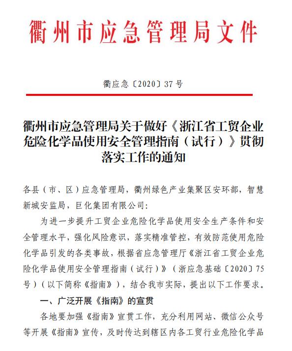 衢州应急局关于做好省工贸企业危化品使用安全管理指南的通知(衢应急〔2020〕37 号)