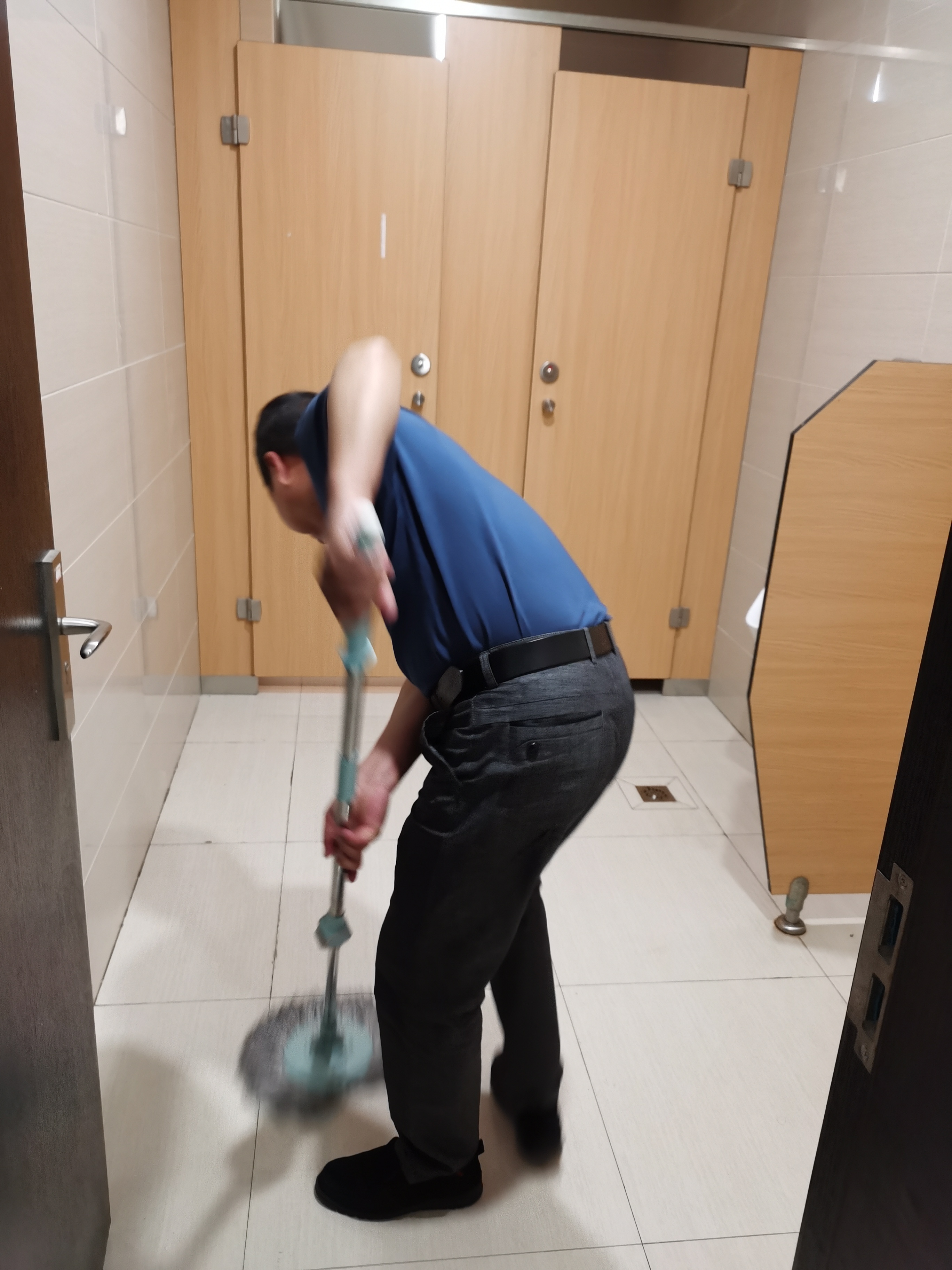 图为公司总工马兆云同志不怕脏、累带头打扫卫生间,给大家开启了一个良好的示范。