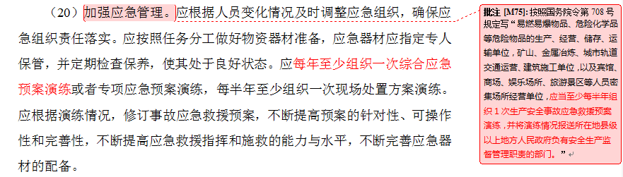 (20)加强应急管理。应根据人员变化情况及时调整应急组织,确保应急组织责任落实。应按照任务分工做好物资器材准备,应急器材应指定专人保管,并定期检查保养,使其处于良好状态。应每年至少组织一次综合应急预案演练或者专项应急预案演练,每半年至少组织一次现场处置方案演练。应根据演练情况,修订事故应急救援预案,不断提高预案的针对性、可操作性和完善性,不断提高应急救援指挥和施救的能力与水平,不断完善应急器材的配备。
