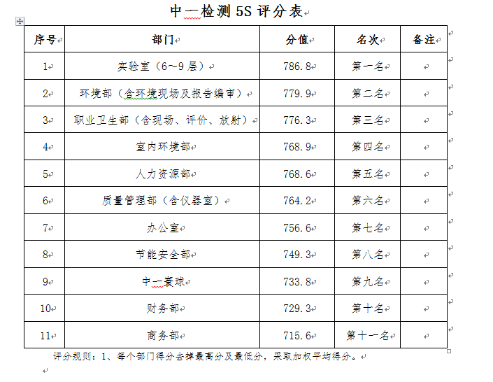 经过大家几天的辛勤劳动,经过今天上午11位总经办领导及优秀员工代表的辛苦现场评审打分及紧张计算,在部门负责人的见证和监督下,今年首次5S劳动竞赛决出了结果,现予以公布。我们向表现优异的团队表示祝贺,周二早上应总将向他们颁发奖金及奖牌;同时希望落后的部门持续改进。5S是一项长期工作,希望全体员工持之以恒,力争优秀。