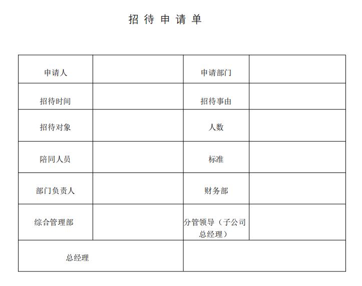 12.1、公司业务招待费用实行提前申请、定额审批的原则,对口部门申请业务招待前必须填写《业务招待申请单》,注明招待事由、人数、项目和预计消费金额等信息,综合管理部根据招待级别确定标准,经相关领导批准后执行。