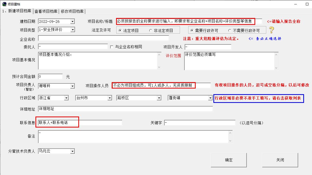一、项目建档(新建项目)要求: 1、项目名称:必须按报告的全称要求进行输入,即要求有企业名称+项目名称+评价类型等信息。 2、评价范围:必须明确填写评价范围 3、项目操作人员:可以填写1人和多人,项目操作人员不一定是要项目组成员,其人员不要求一定要具备安全评价人员资质。 4、行政区域:必须通过系统选择,不得手工填写。所有行政区域信息必须完整填写。 5、联系信息:必须包括联系人和联系电话,不能光有联系人。