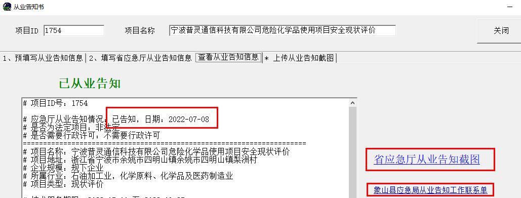 5、安全评价项目的从业告知后,您可以通过系统中看到告知时间和截图,若长时间未发现有告知的时间和截图,请联系管理员。