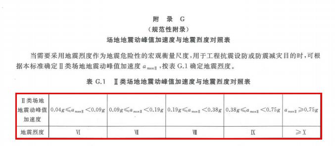 根据峰值加速度a的数据,根据标准附录G,可确定地震烈度等级。