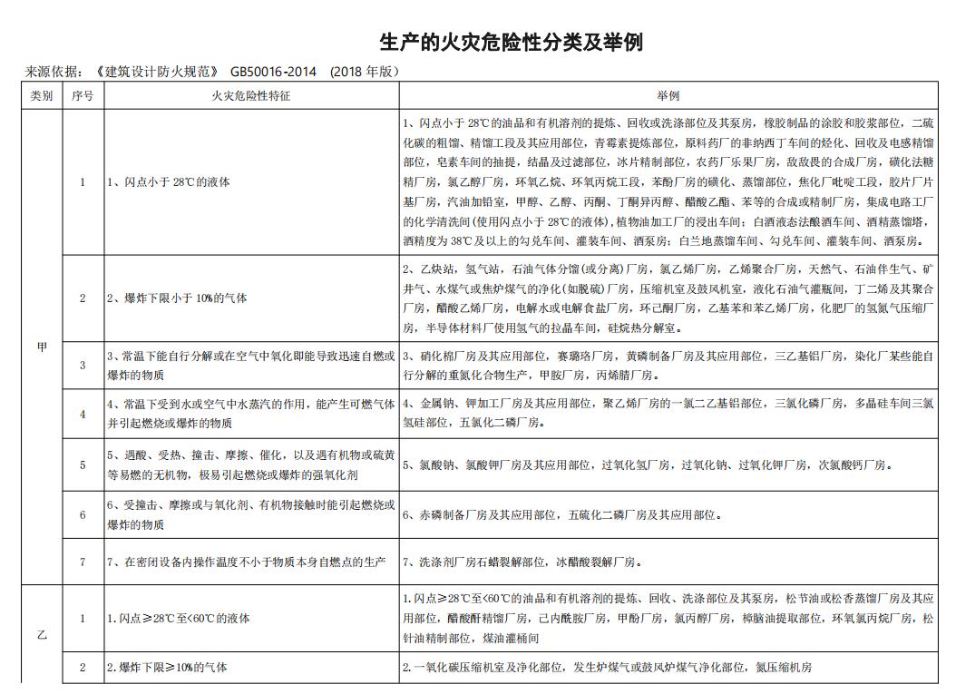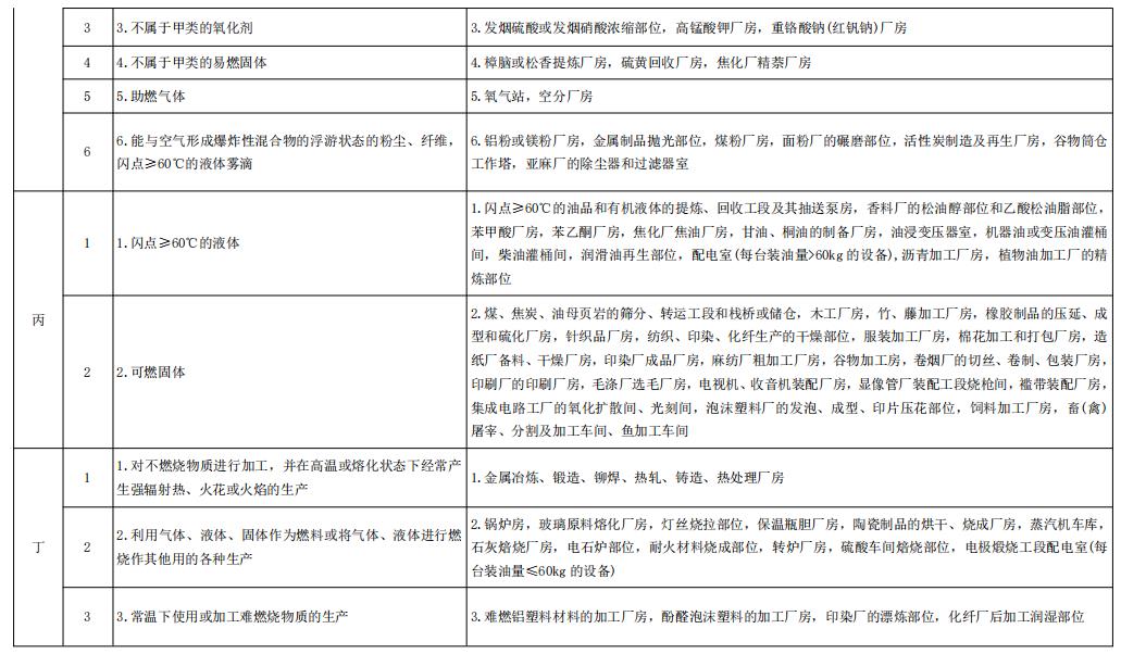 生产的火灾危险性分类及举例